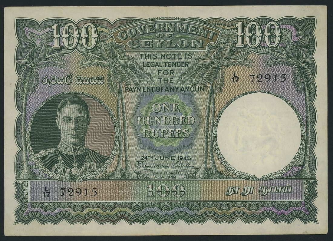Government of Ceylon, 100 Rupees, 24th June 1945, serial number L/17 72915, (Pick 38a), good very fine, staple holes