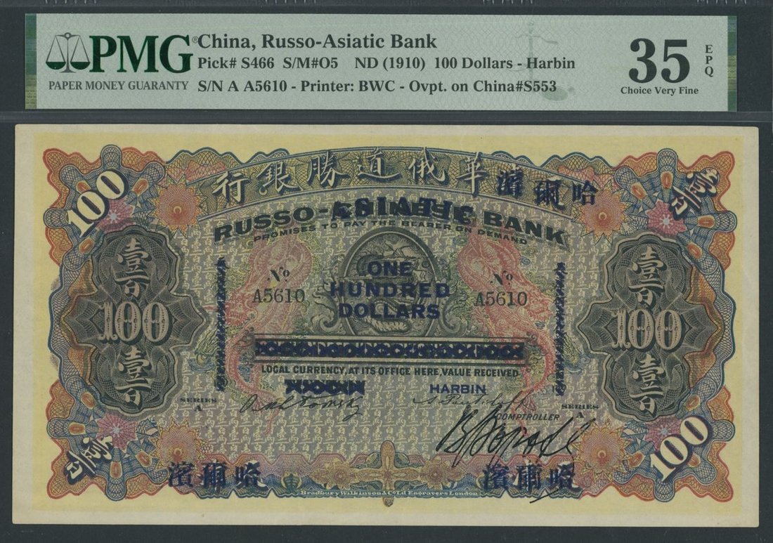 Russo-Asiatic Bank, China, 100 Dollars, ND (1910), serial number A5610, (Pick S466), in PMG holder 35 EPQ Choice Very Fine