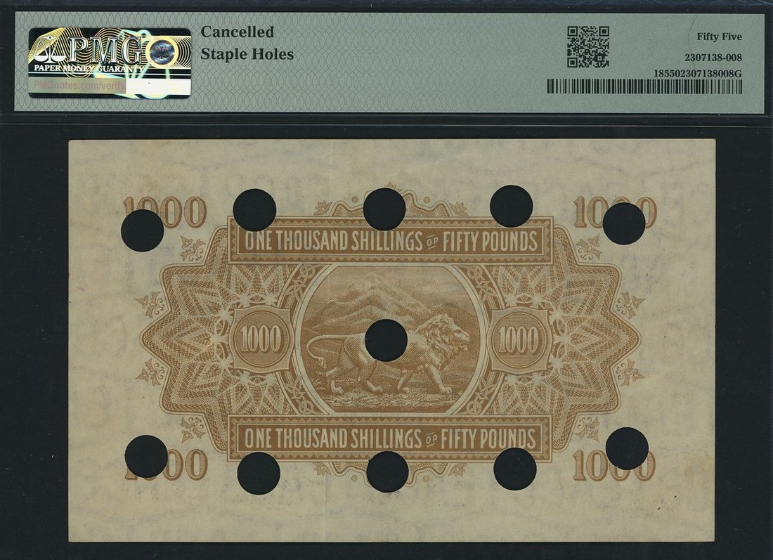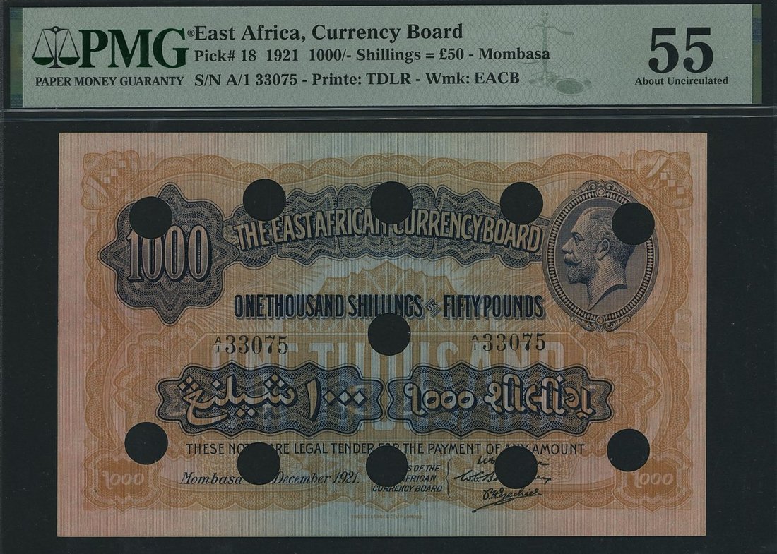 (Pick 18a, TBB B214a), in PMG holder 55 About Uncirculated, cancelled, staple holes, the single finest graded on PMG census (with no other examples in this grade). Only a handful of surviving examples of the 1000/- notes are known. In 1921 holding significant purchasing power, equivalent to £50 (£2150~ as of October 2025), was demonetised with punch-hole cancellations, most likely by EACB, for reasons known only to the Board itself. Incredible and fascinating!
