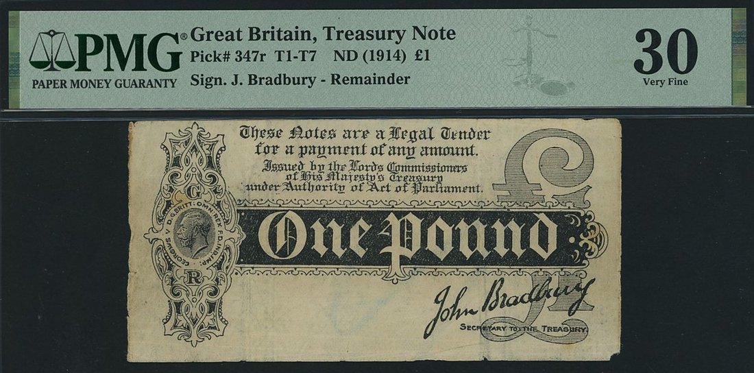 Treasury Series, John Bradbury, *TOP POP* remainder £1, ND (1914), no serial number, (EPM T1-7, Pick 347r), in PMG holder 30 Very Fine, corner tip missing, tied for finest graded with just one other example on PMG Census, rare