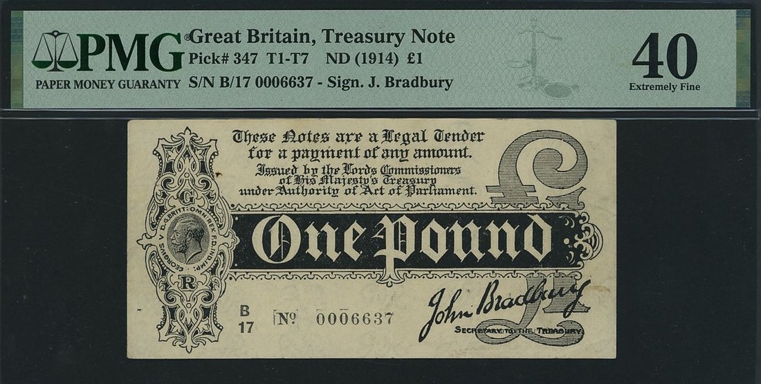 Treasury Series, John Bradbury, £1, 1914, serial number B/17 0006637, (EPM T5.4b, Pick 347), in PMG holder 40 Extremely Fine, pinholes