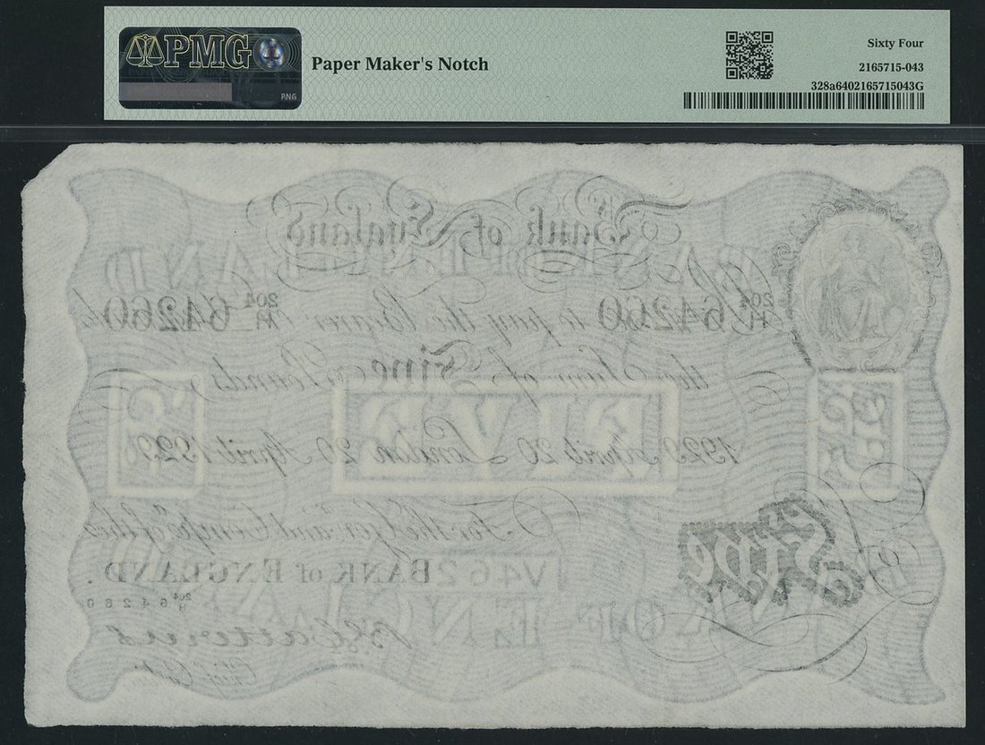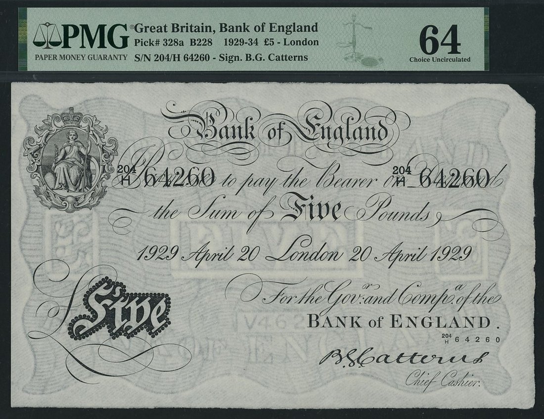 Bank of England, B. G. Catterns, £5, London, 20th April 1929, serial number 204/H 64260, (EPM B228, Pick 328a), in PMG holder 64 Choice Uncirculated, paper maker's notch