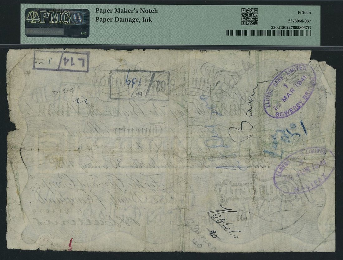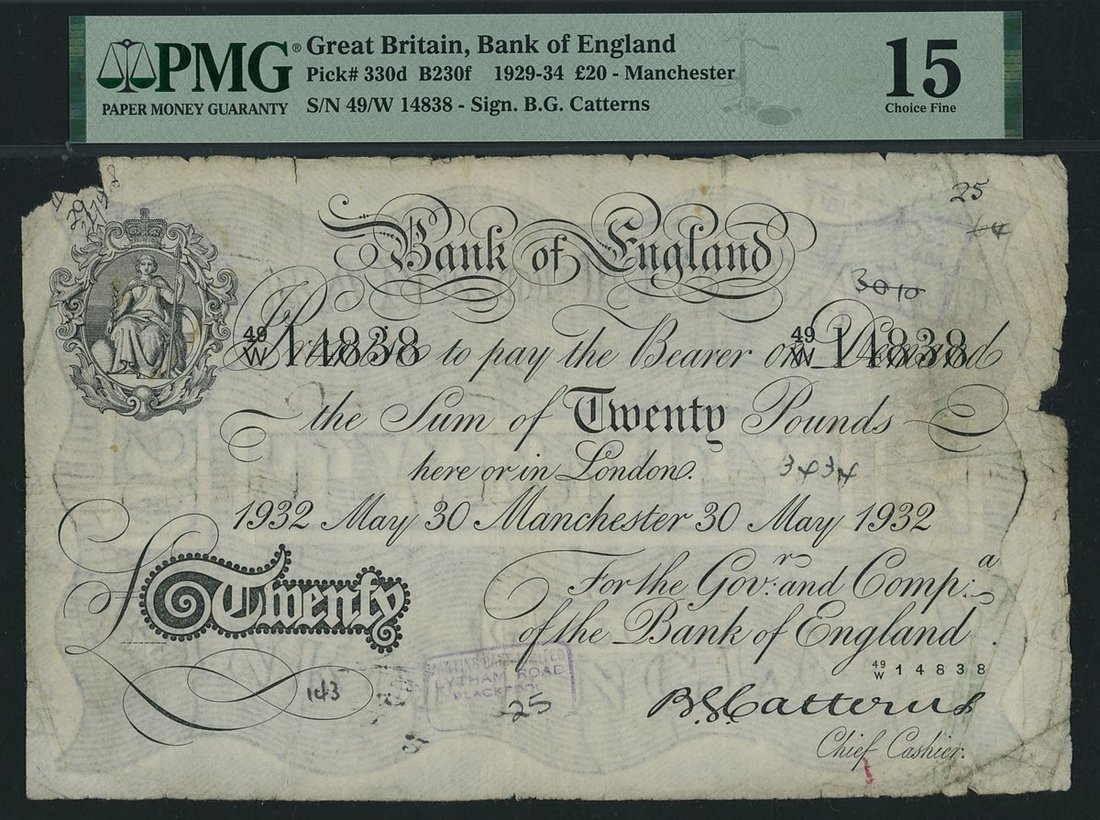 Bank of England, B. G. Catterns, £20, Manchester, 30th May 1932, serial number 49/W 14838, (EPM B230f, Pick 330d), in PMG holder 15 Choice Fine, paper maker's notch, paper damage, ink, only 1 note in higher grade on PMG Census