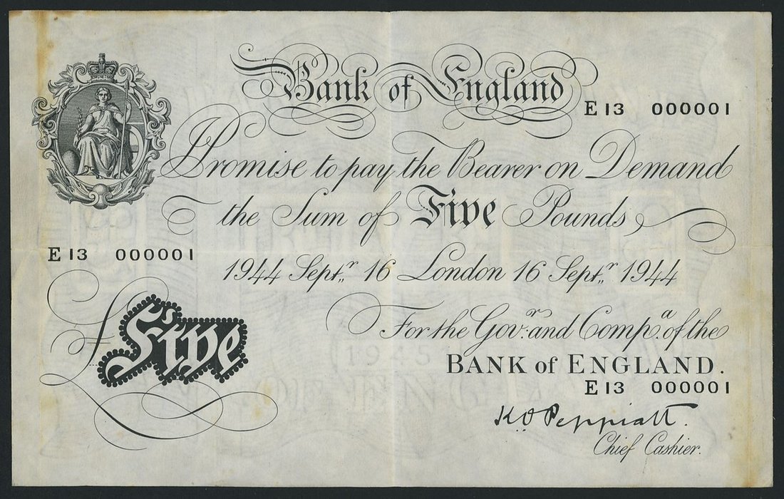 Bank of England, K. O. Peppiatt, £5, London, 16th September 1944, ultra-low first serial number E13 000001, (EPM B255, Pick 342), fine, small centre hole and minor staining