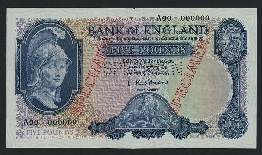 Bank of England, L. K. O'Brien, specimen, £5, MD (1957), serial number A00 000000, (EPM B277s, Pick 371s), about uncirculated, small tear at the upper margin