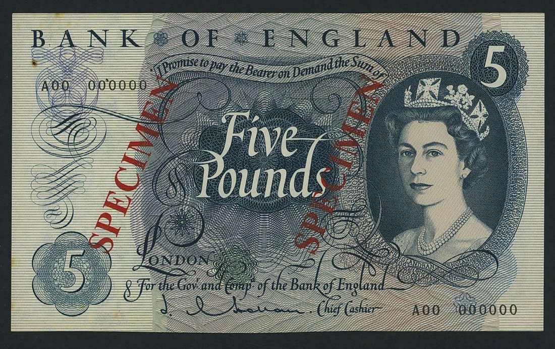 Bank of England, J. Q. Hollom, specimen £5, ND (1963), serial number A00 000000, (EPM B297s, 375s), about uncirculated