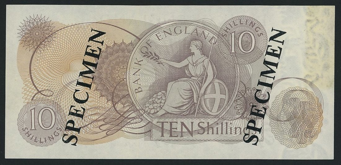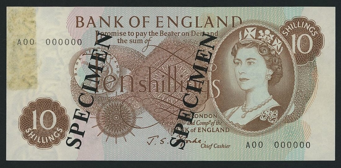 Bank of England, J. S. Fforde, specimen 10/- Shillings, ND (1967), serial number A00 000000, (EPM B309s, Pick 373s), mounting remnant, colour fading otherwise about uncirculated