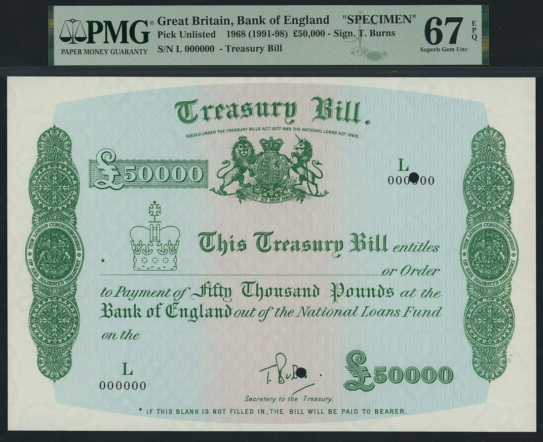 Bank of England, Treasury Bill, specimen £50,000, 1968 (1991-98), serial number L 000000, (Pick unlisted), in PMG holder 67 EPQ Superb Gem Uncirculated
