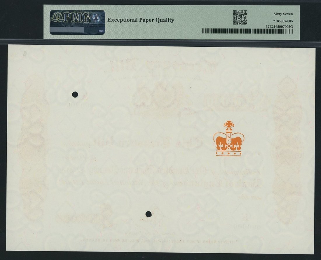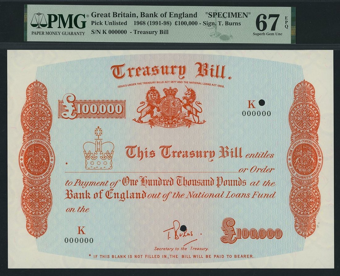 Bank of England, Treasury Bill, specimen £100,000, 1968 (1991-98), serial number K 000000, (Pick unlisted), in PMG holder 67 EPQ Superb Gem Uncirculated