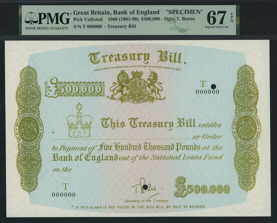 Bank of England, Treasury Bill, specimen £500,000, 1968 (1991-98), serial number T 000000, (Pick unlisted), in PMG holder 67 EPQ Superb Gem Uncirculated