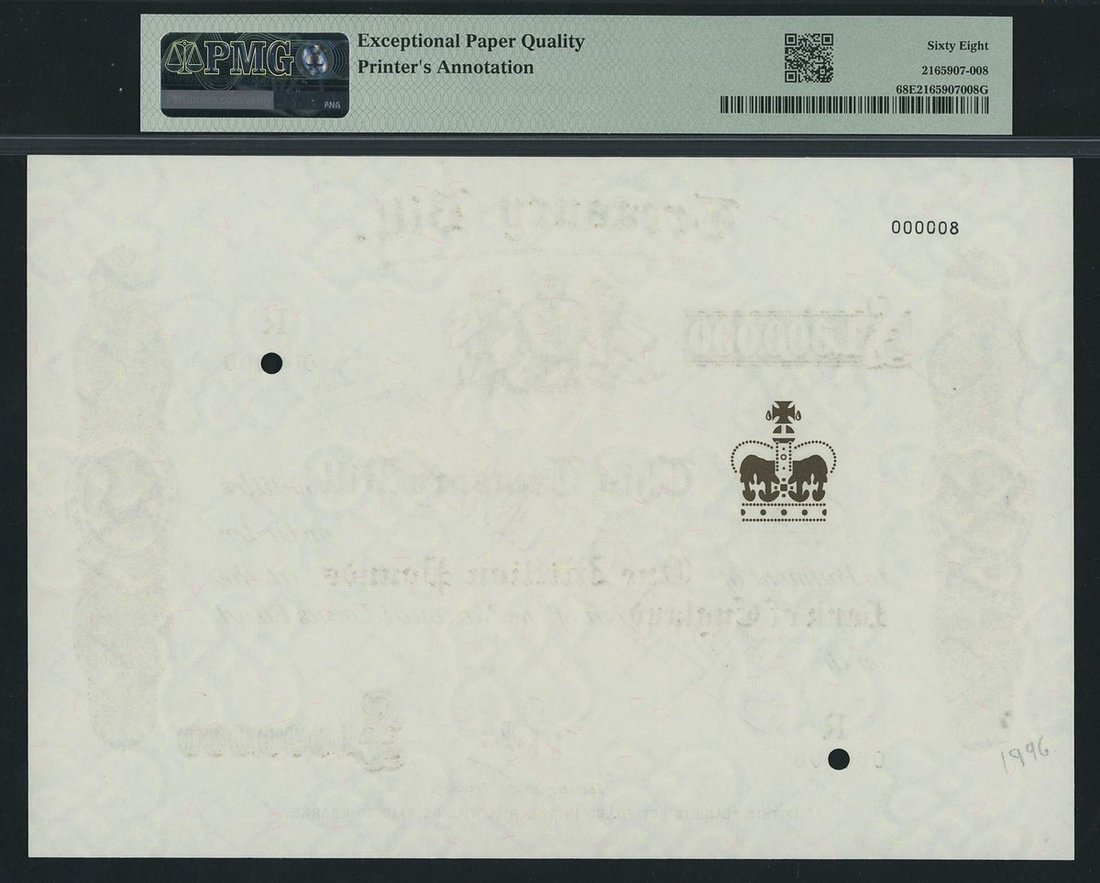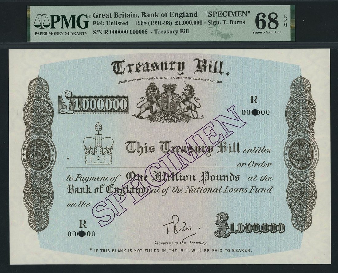Bank of England, Treasury Bill, specimen £1,000,000, 1968 (1991-98), serial number R 000000, specimen number 000008, (Pick unlisted), in PMG holder 68 EPQ Superb Gem Uncirculated