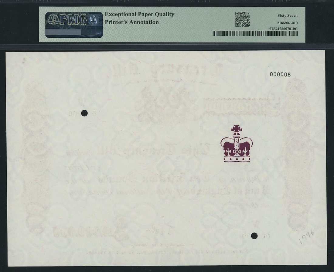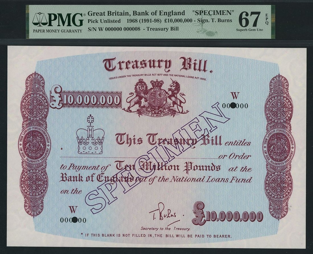 Bank of England, Treasury Bill, specimen £10,000,000, 1968 (1991-98), serial number W 000000, specimen number 000008, (Pick unlisted), in PMG holder 67 EPQ Superb Gem Uncirculated