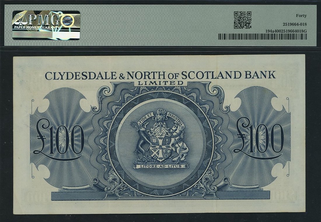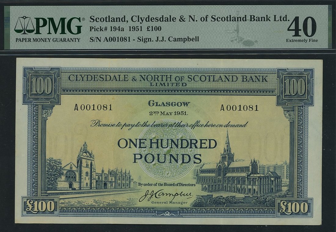 Clydesdale & North of Scotland Bank, £100, 2nd May 1951, serial number A001081, (PMS CL 27a, Pick 194a), in PMG holder 40 Extremely Fine