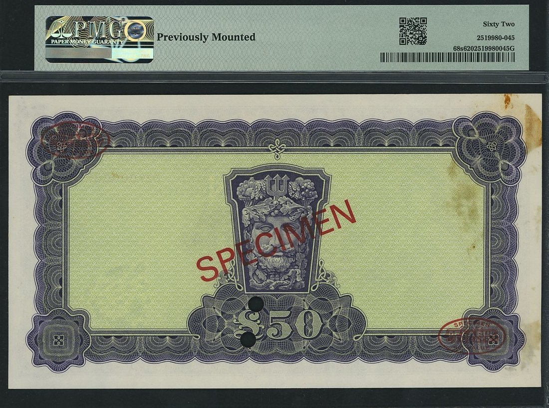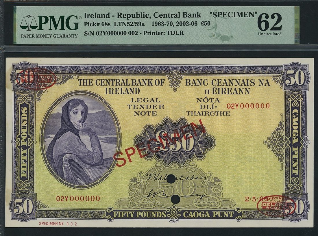 Central Bank of Ireland, Republic of Ireland, specimen £50, fictitious date 2nd May 1906, serial number 02Y 000000 002, (PMI LTN 58as, Pick 68s), in PMG holder 62 Uncirculated, previously mounted, an early Specimen number and matching with the next lot