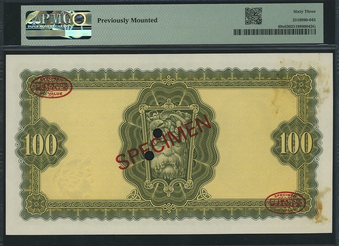 Central Bank of Ireland, Republic of Ireland, specimen £100, fictitious date 2nd May 1906, serial number 02Z 000000 002, (PMI LTN 59as, Pick 69s), in PMG holder 63 Choice Uncirculated, previously mounted, an early Specimen number and matching with the previous lot