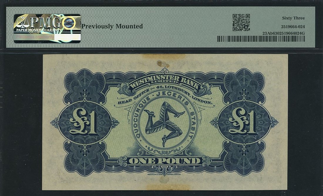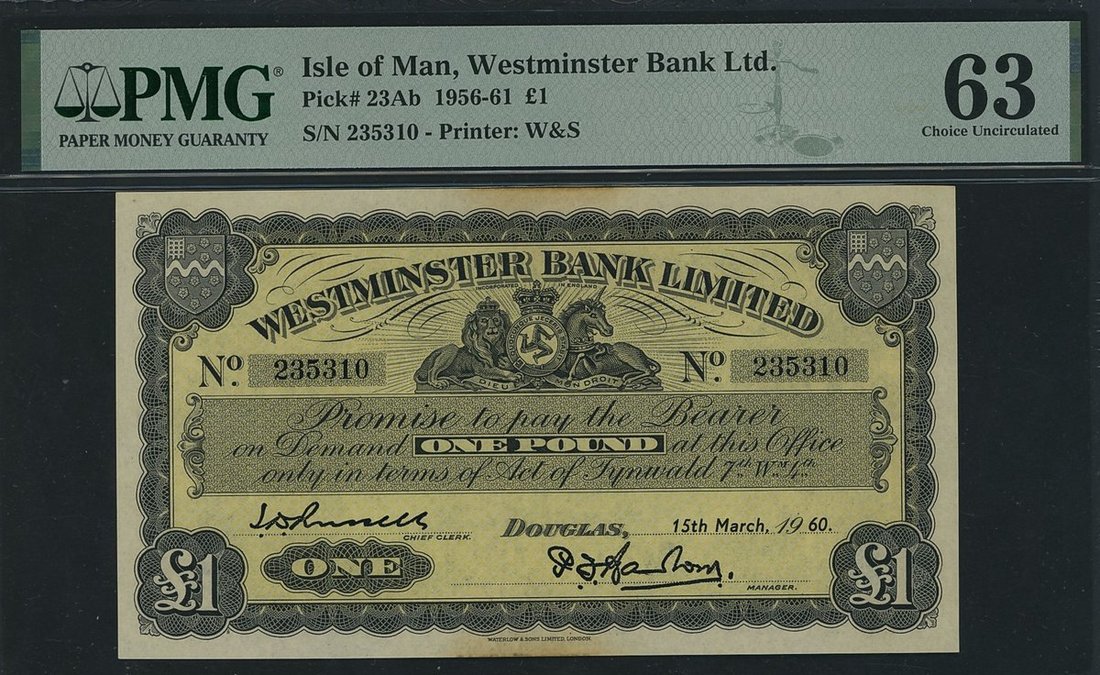 Westminster Bank, Isle of Man, £1, 15th March 1960, serial number 235310, (IoMPM M314, Pick 23Ab), in PMG holder 63 Choice Uncirculated, previously mounted