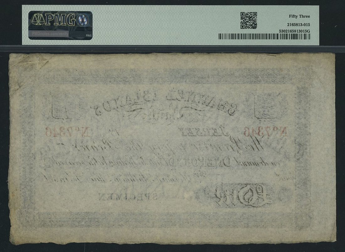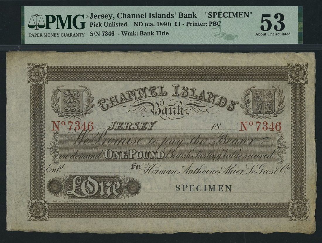 Channel Islands Bank, Jersey, specimen £1, ND (ca. 1840), serial number 7346, (Pick Unlisted), in PMG holder 53 About Uncirculated, a wonderful note