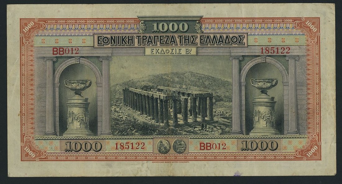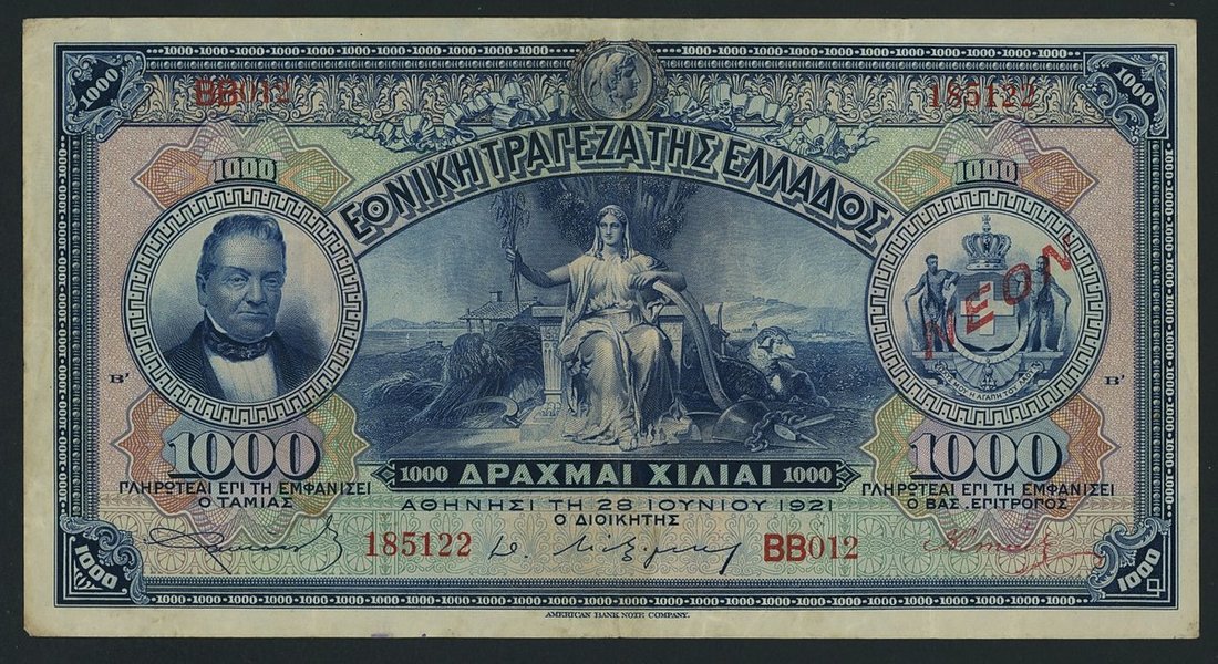 National Bank of Greece, 1000 Drachmai, 28th June 1921, serial number BB012 185122, (Pick 69a), about very fine