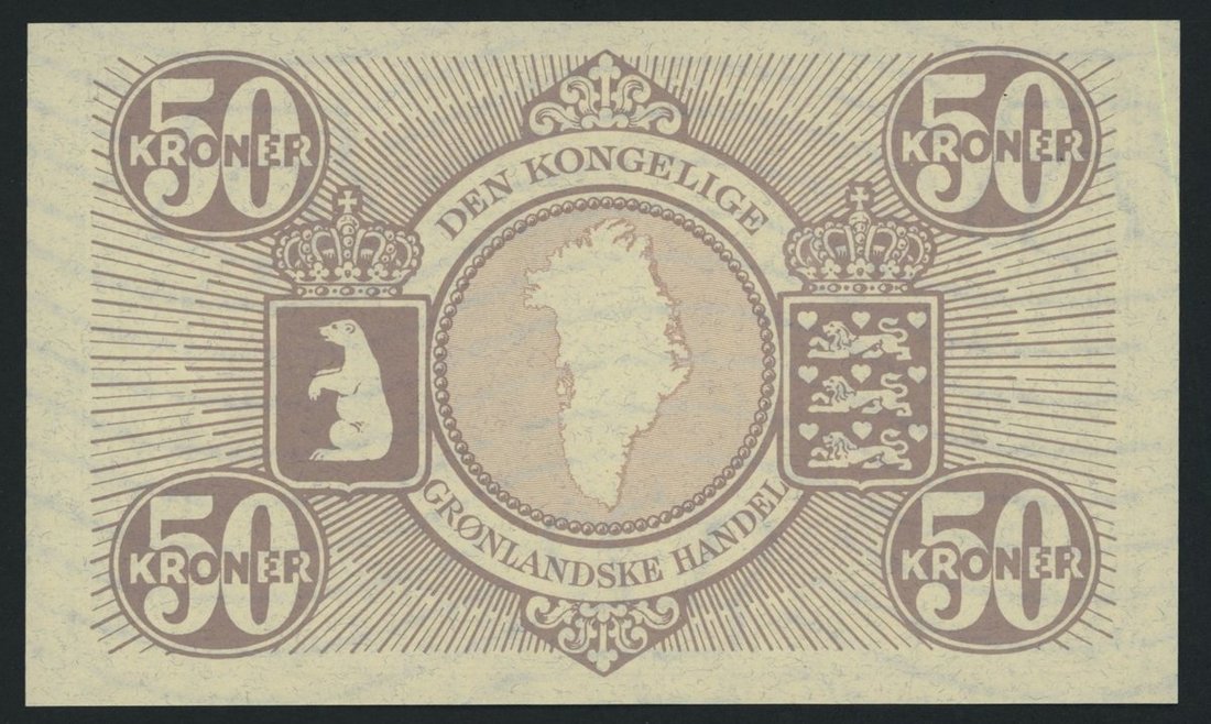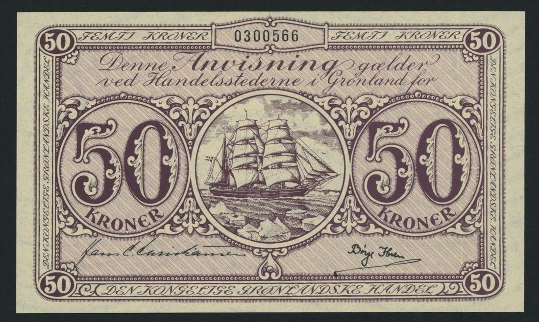 Den Kongelige Grønlandske Handel, Greenland, 50 Kroner, ND (1953-67), serial number 0300566, Hans C. Christensen signature,