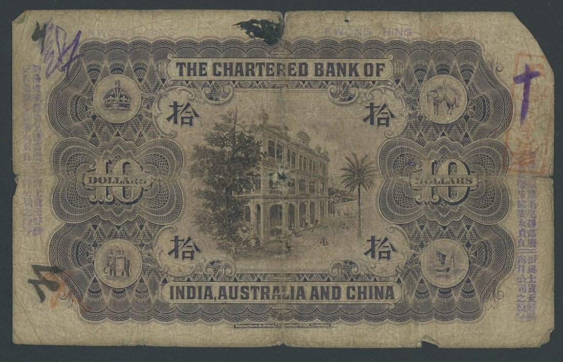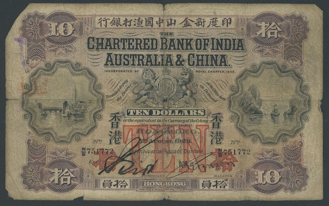 Chartered Bank of India. Australia & China, Hong Kong, 10 Dollars, 1st August 1929, serial number N/B 751772, (Pick 50), very good, centre hole, corners and pieces from margin missing, annotations and handstamps on reverse, nevertheless a scarce and sought after type