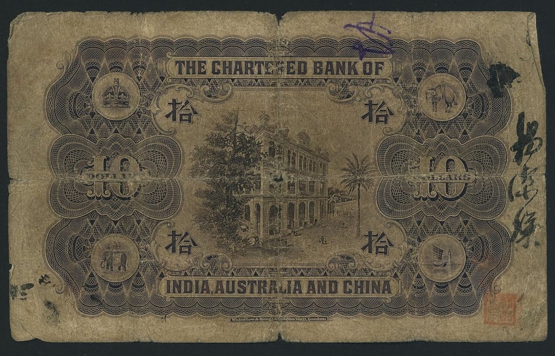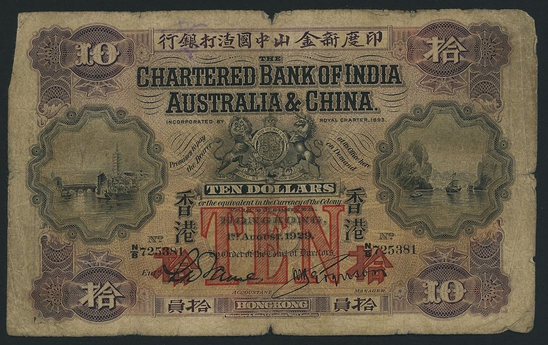 Chartered Bank of India. Australia & China, Hong Kong, 10 Dollars, 1st August 1929, serial number N/B 725381, (Pick 50), very good, centre hole, annotations and handstamp on reverse, nevertheless a scarce and sought after type
