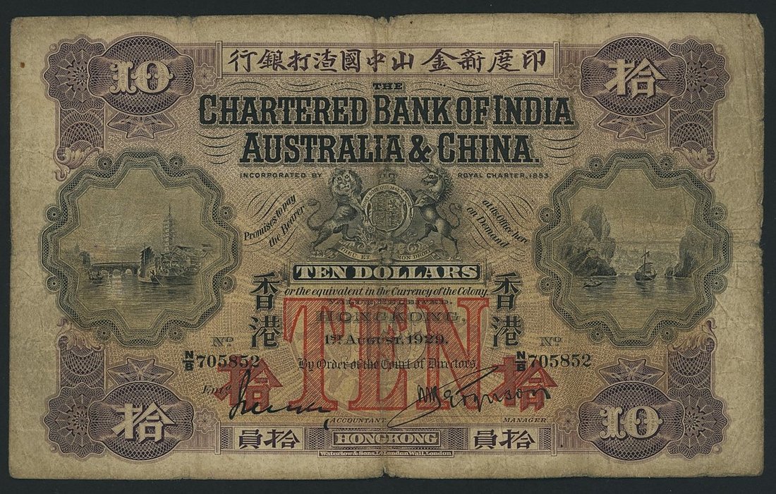 Chartered Bank of India. Australia & China, Hong Kong, 10 Dollars, 1st August 1929, serial number N/B 705852, (Pick 50), very good, centre hole, scarce and sought after in any grade