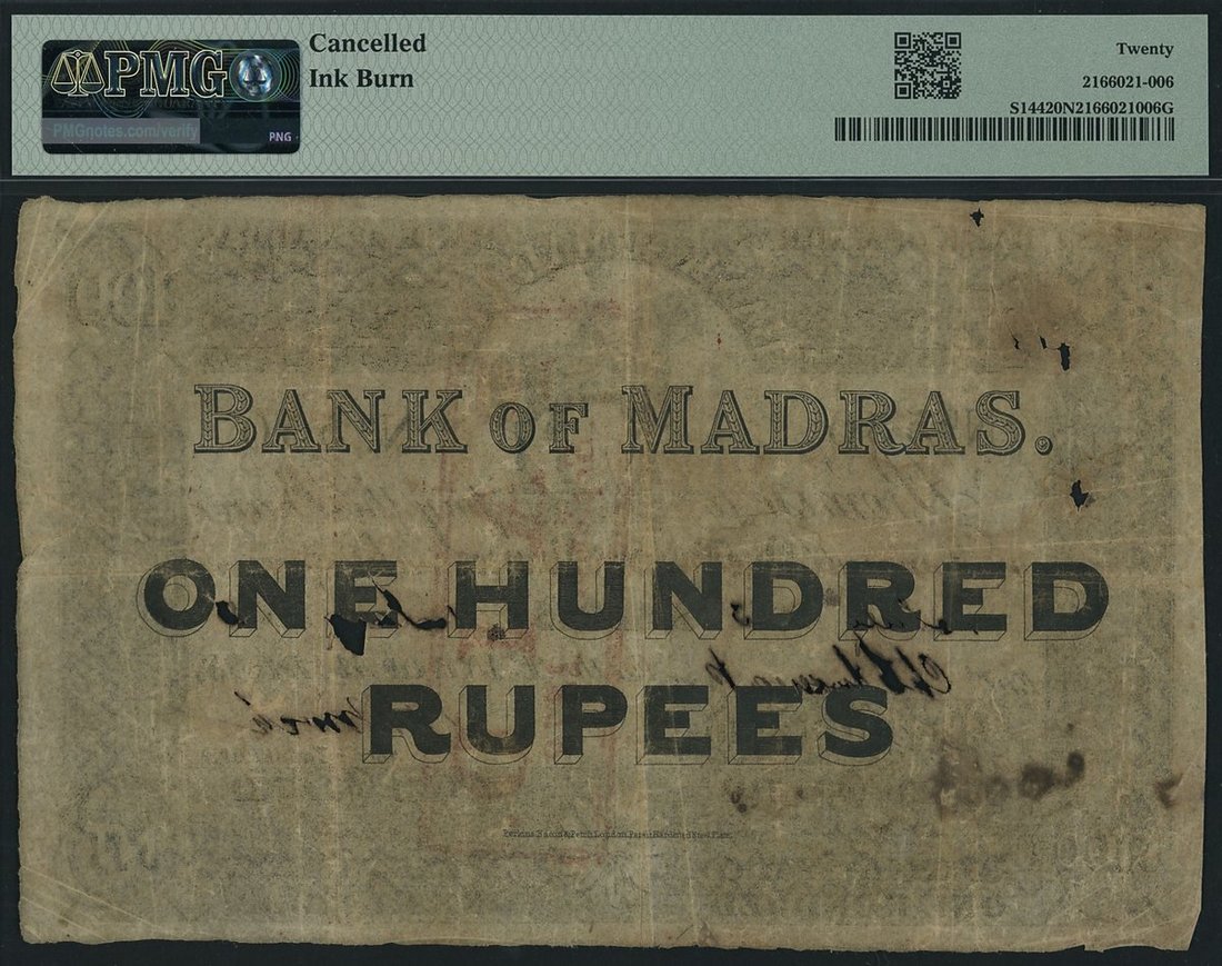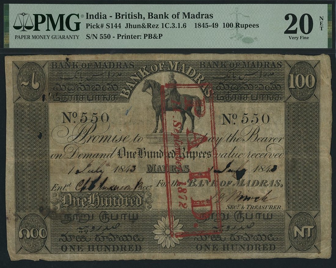 Bank of Madras, India, *TOP POP* 100 Rupees, 1st July 1843, serial number 550, sign. S. D. Birch, plate type 1,