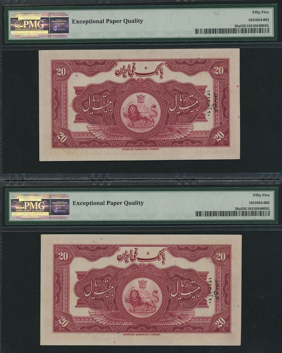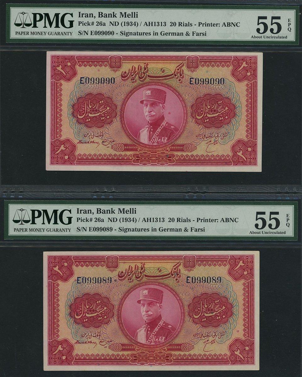 Bank Melli, Iran, [2 notes] 20 Rials, ND (1934), consecutive serial numbers E099089, E099090, Hajier and Ala'a signatures,
