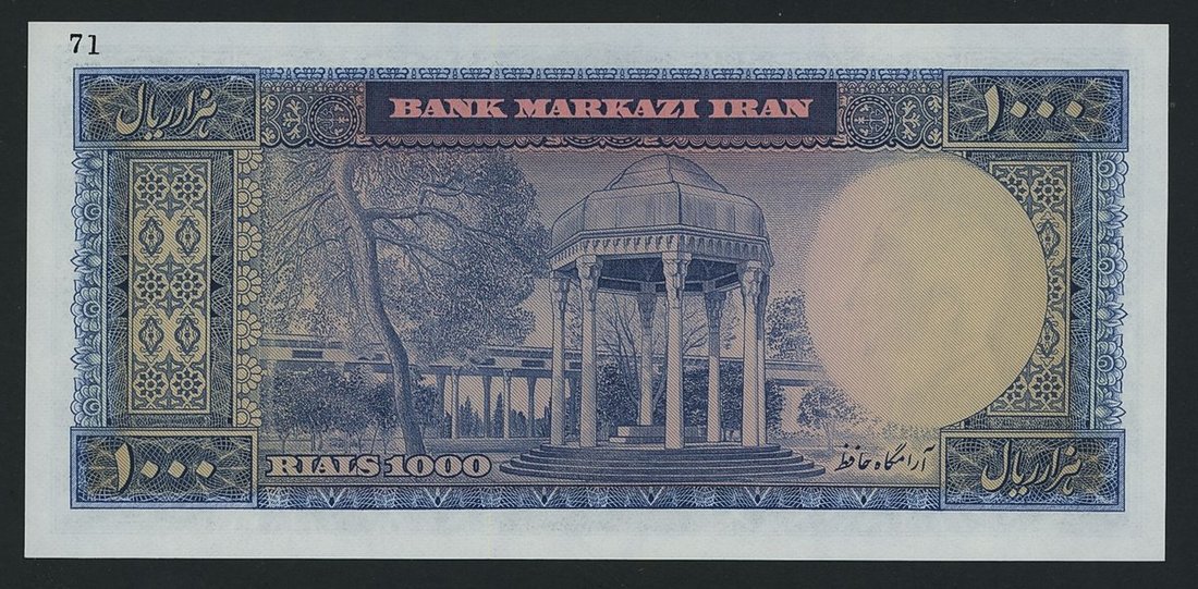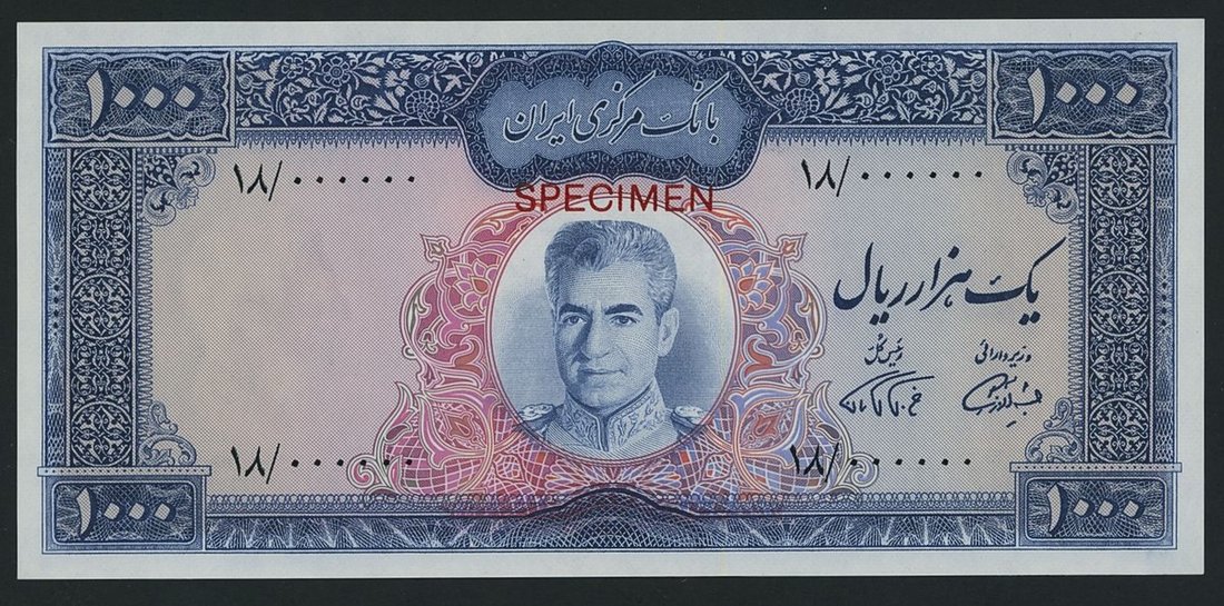 Bank Markazi, Iran, colour trial specimen 1000 Rials, ND (1971-1973), serial number 18/000000, (Pick 94cts, BNB 225), good about uncirculated.