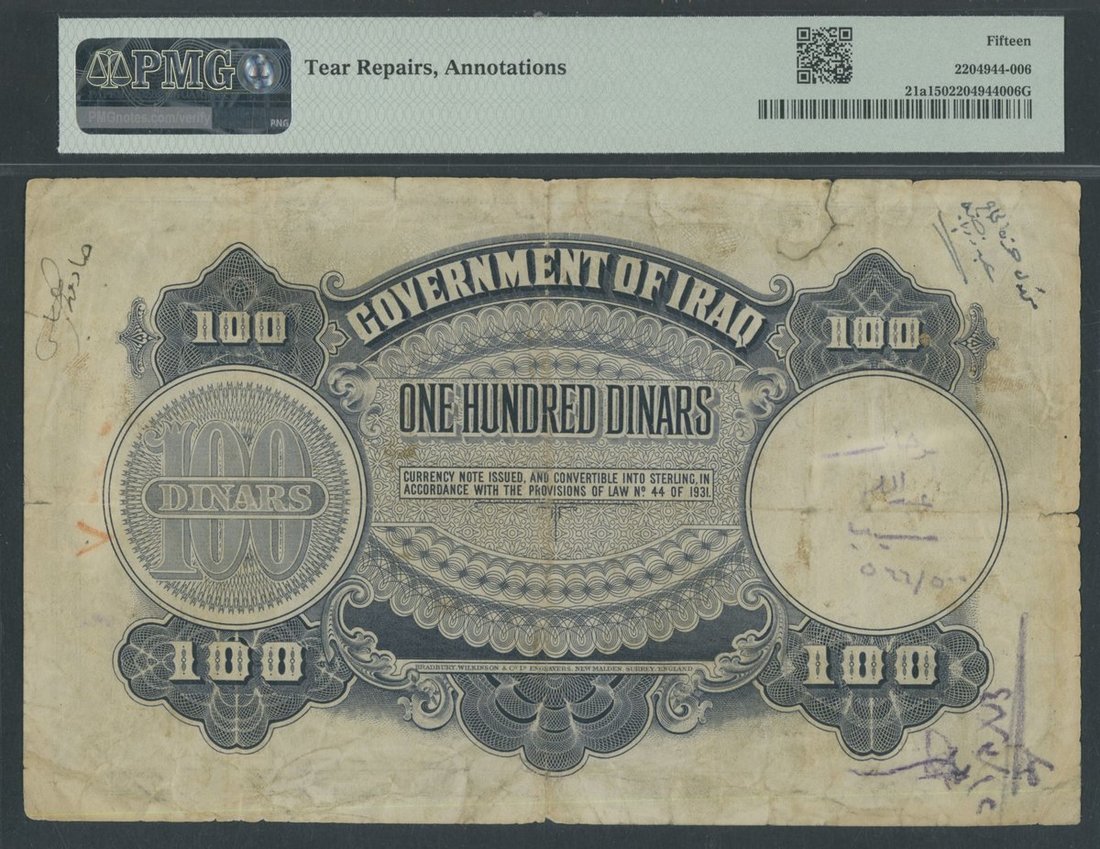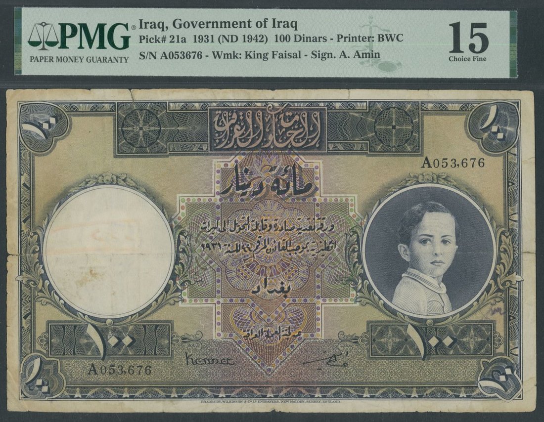 Government of Iraq, 100 Dinars, 1931 (ND 1942), serial number A053676, A. Amin signature,