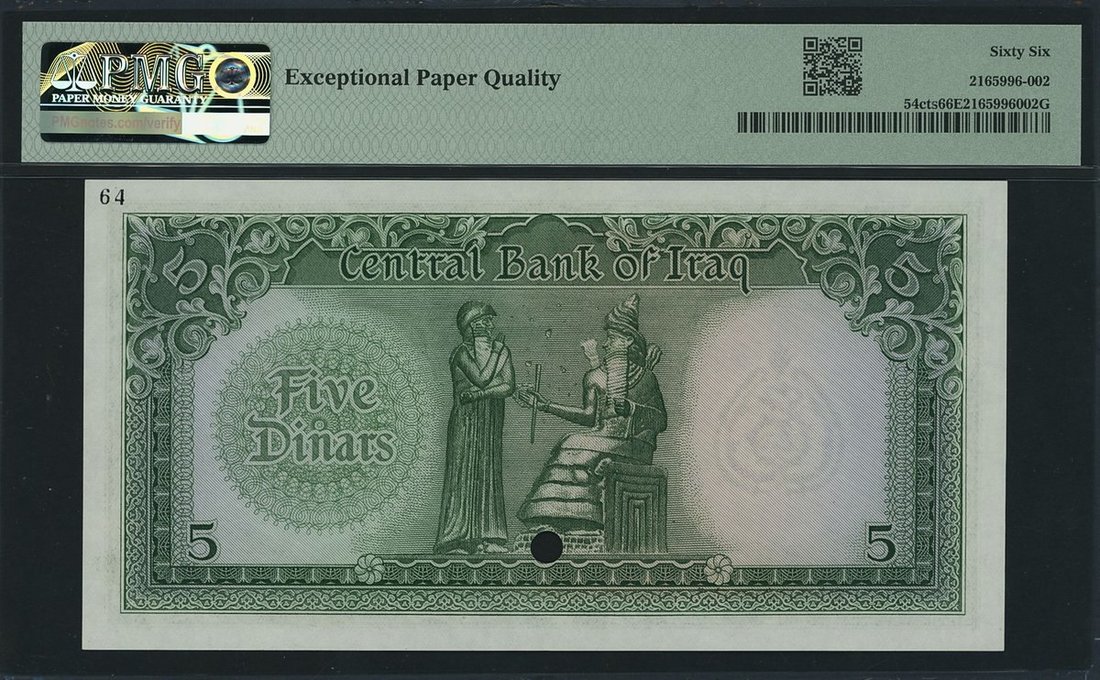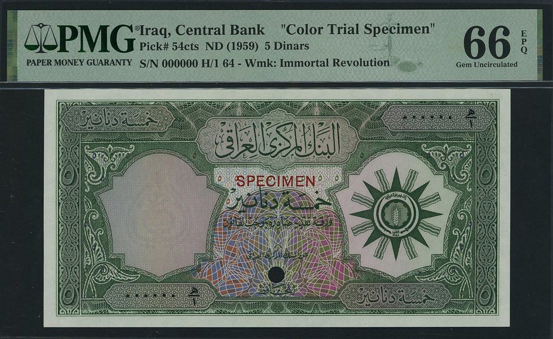 Central Bank of Iraq, colour trial specimen, 5 Dinars, ND (1958), (Pick 54cts, BNB 311at), in PMG holder 66 EPQ Gem Uncirculated