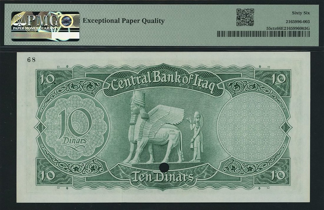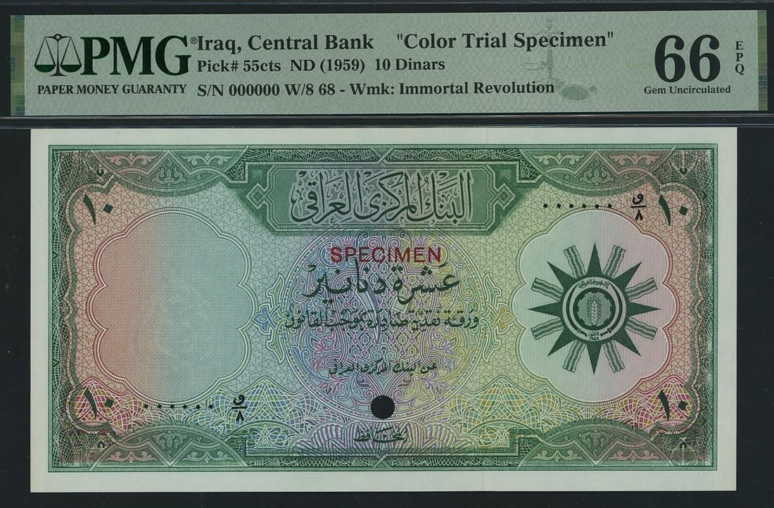 Central Bank of Iraq, colour trial specimen, 10 Dinars, ND (1958), (Pick 55cts, BNB 312t), in PMG holder 66 EPQ Gem Uncirculated