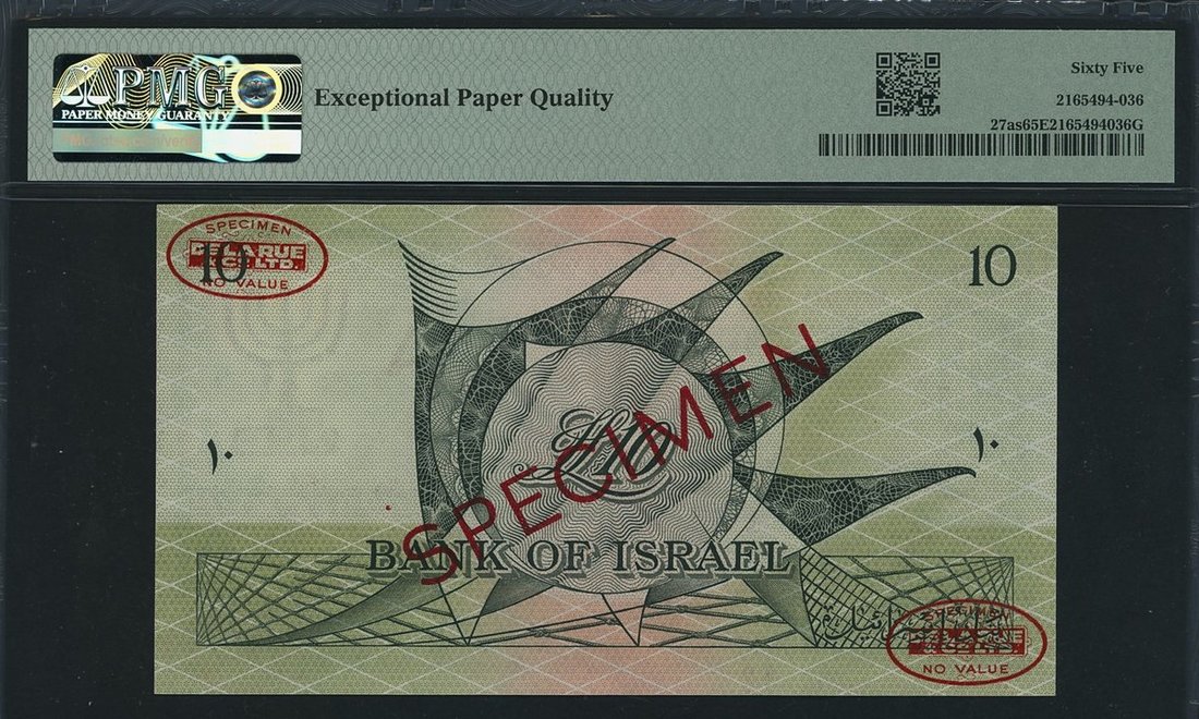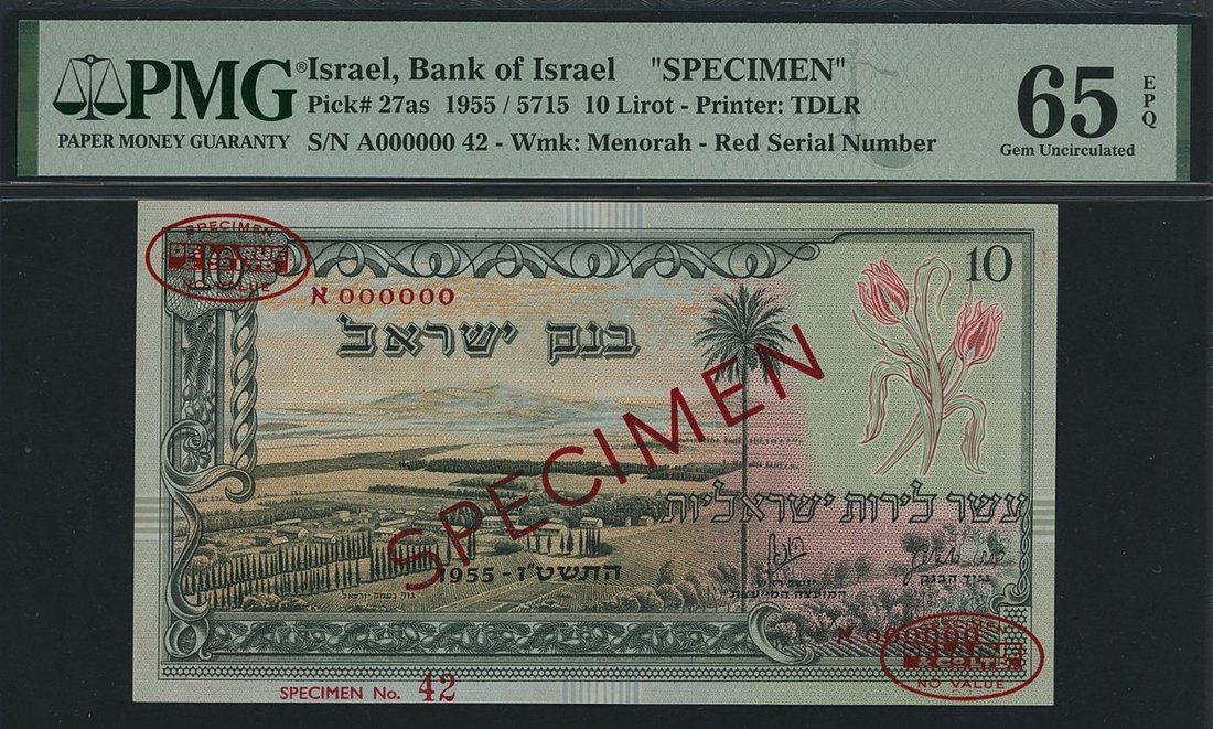 Bank of Israel, specimen, 10 Lirot, 1955 / 5715, red serial number A000000 42, (Pick 27as, BNB 404), in PMG holder 65 EPQ Gem Uncirculated