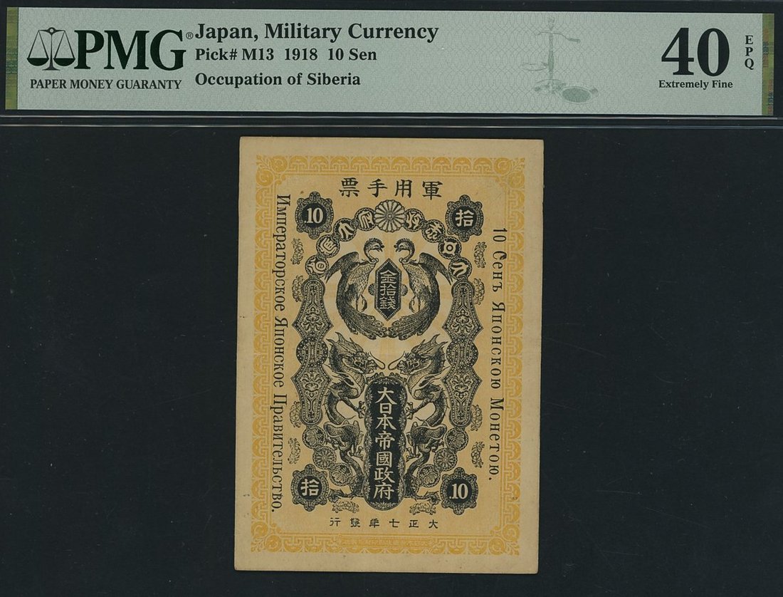 Japanese Military Currency, 10 Sen, 1918, no serial numbers, black on ochre, dragons and phoenixes with, Russian overprint, issued for use during the Japanese occupation of Siberia,