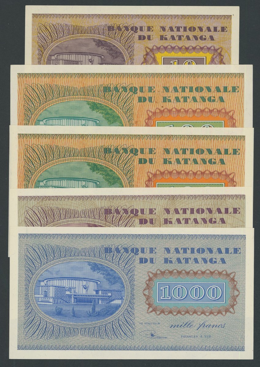 National Bank of Katanga, [5 notes], 10, 100, 500, 100 Francs,