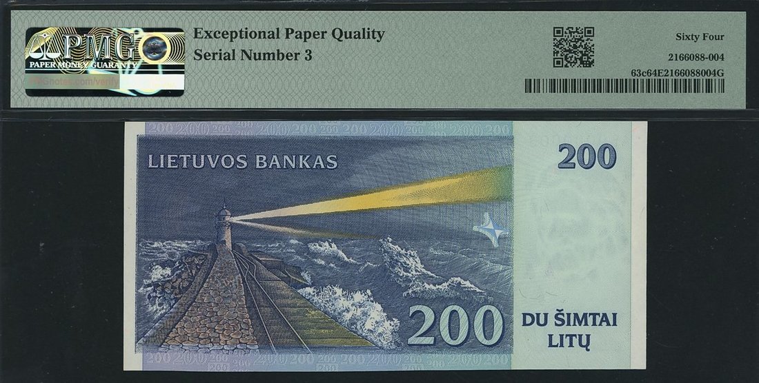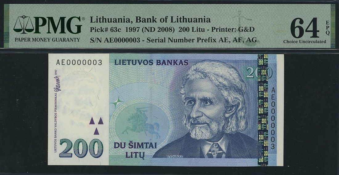 Lietuvos Bankas, Lithuania, 200 Litu, 1997, ultra-low serial number AE0000003, (Pick 63), in PMG holder 64 EPQ Choice Uncirculated, Serial Number 3
