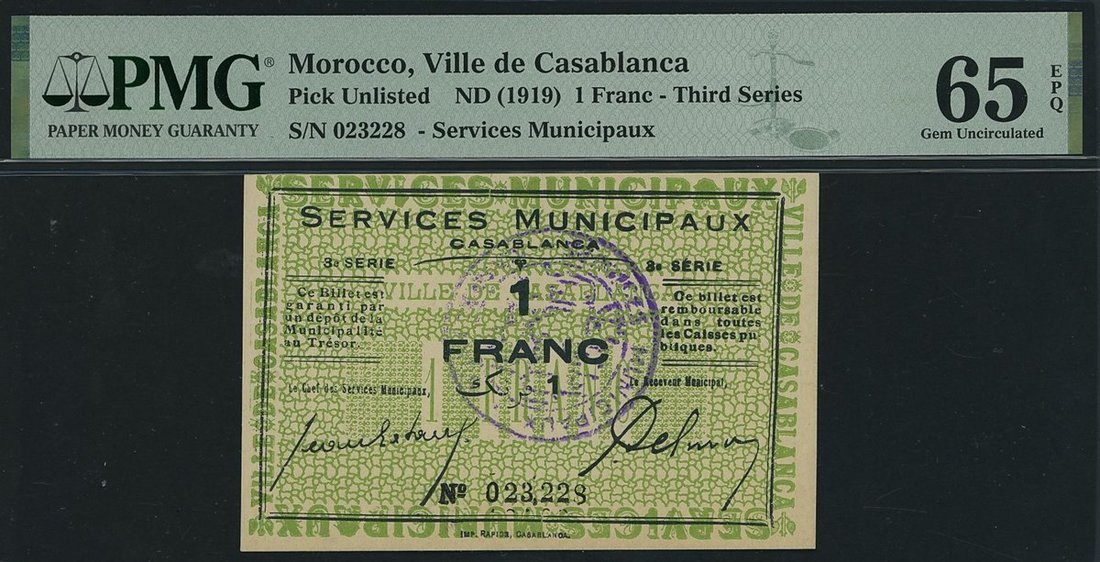Ville de Casablanca, Morocco, 1 Franc, ND (1919), serial number 023228, (Pick Unlisted, K.565), in PMG holder 65 EPQ Gem Uncirculated
