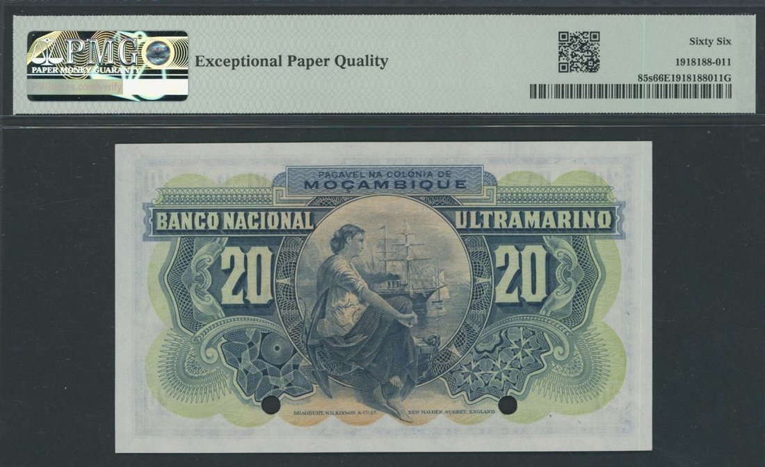 Banco Nacional Ultramarino, Mozambique, specimen 20 Escudos, 1st November 1941, serial number 164, (Pick 85s, BNB MZ88s), in PMG holder 66 EPQ Gem Uncirculated, only 2 notes in higher grade on PMG census
