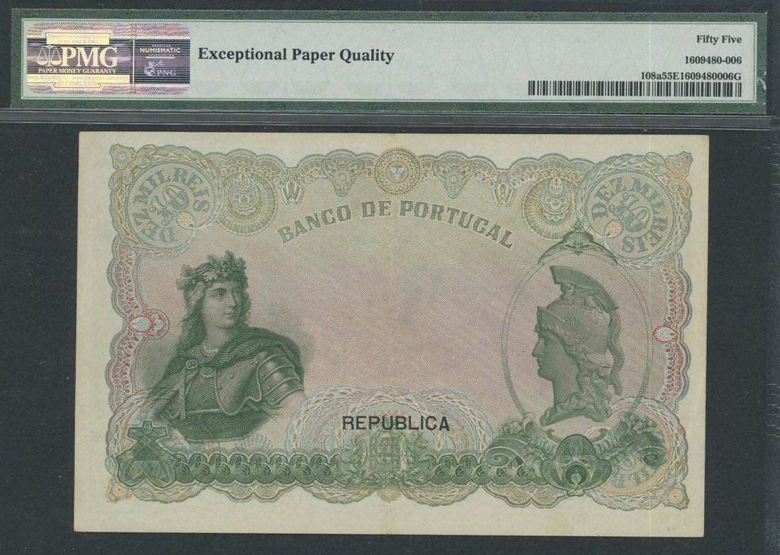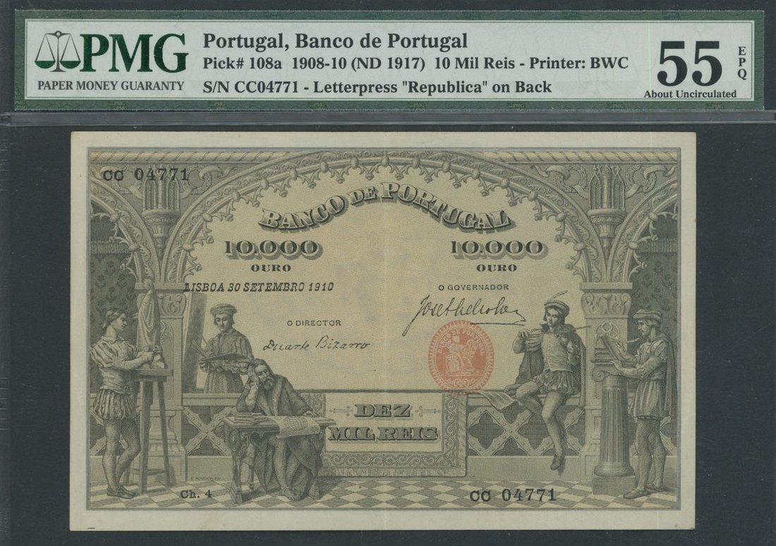 Banco de Portugal, 10.000 Reis, Lisboa, 30th September 1910, serial number CC04771, (Pick 108a), in PMG holder 55 EPQ About Uncirculated, only 3 notes in higher grade on PMG census