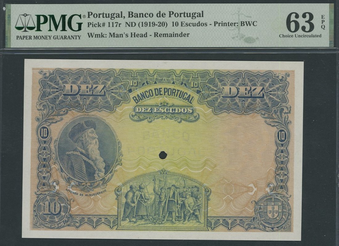 Banco de Portugal, remainder, 10 Escudos, ND (1919–20), no serial number, (Pick 117r), in PMG holder 63 EPQ Choice Uncirculated, cancelled, previously mounted, only 1 note in higher grade on PMG census