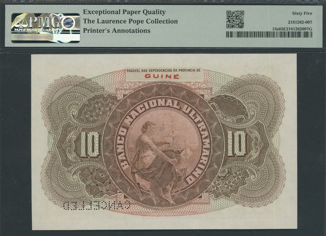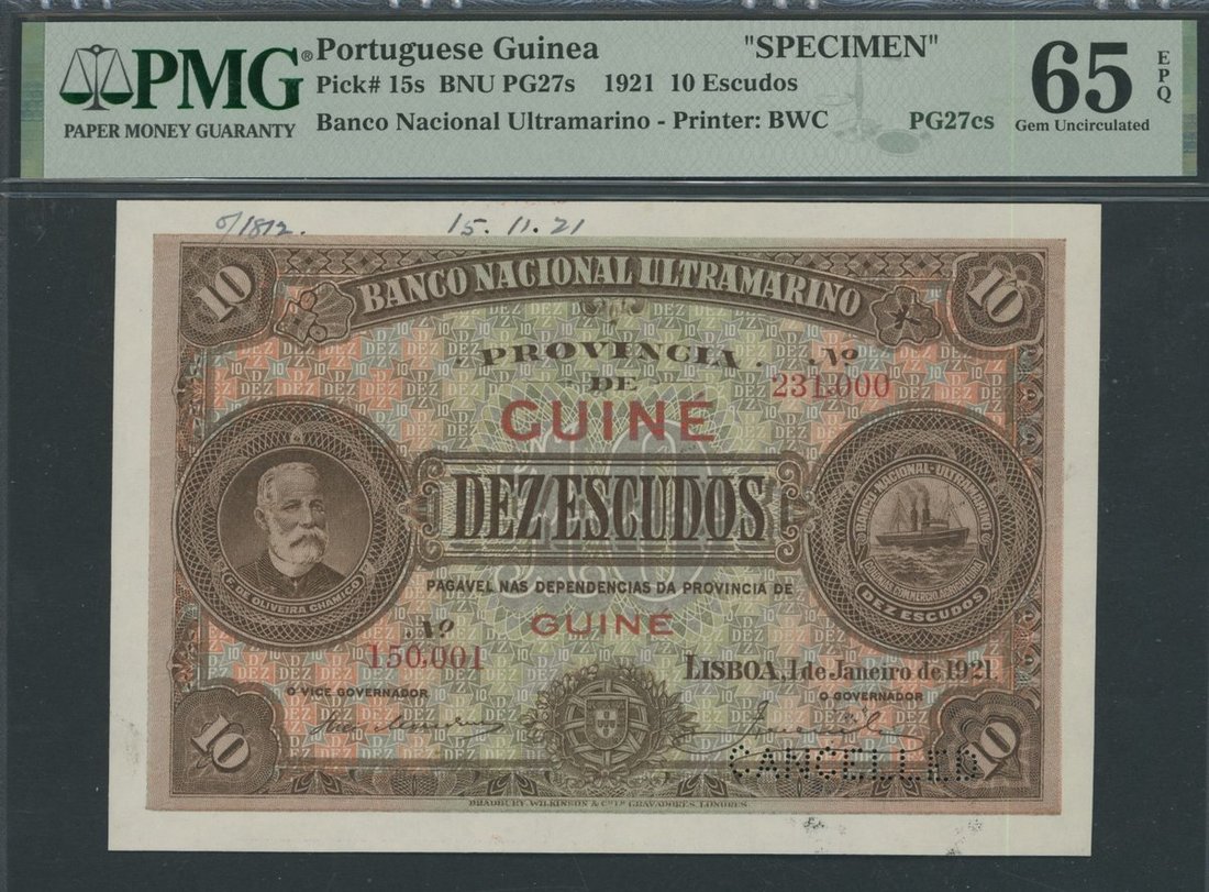Banco Nacional Ultramarino, Portuguese Guinea, *TOP POP* specimen 10 Escudos, 1st January 1921, serial number range 150001/231000, (Pick 15s, BNU PG27s), in PMG holder 65 EPQ Gem Uncirculated, printer's annotations, ex The Laurence Pope Collection, the sole finest graded example for the type on PMG census