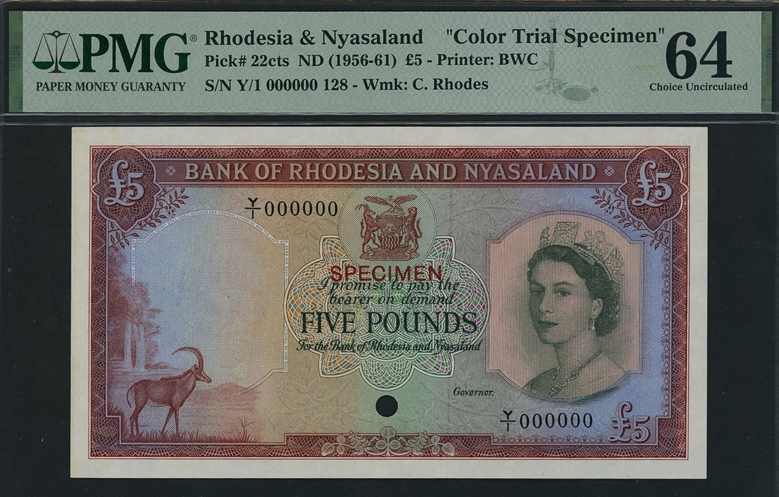Bank of Rhodesia and Nyasaland, colour trial specimen £5, ND (1956), serial number Y/1 000000, specimen number 128, (Pick 22cts, BNB 103t), in PMG holder 64 Choice Uncirculated, previously mounted, only one note in a higher grade on PMG Census