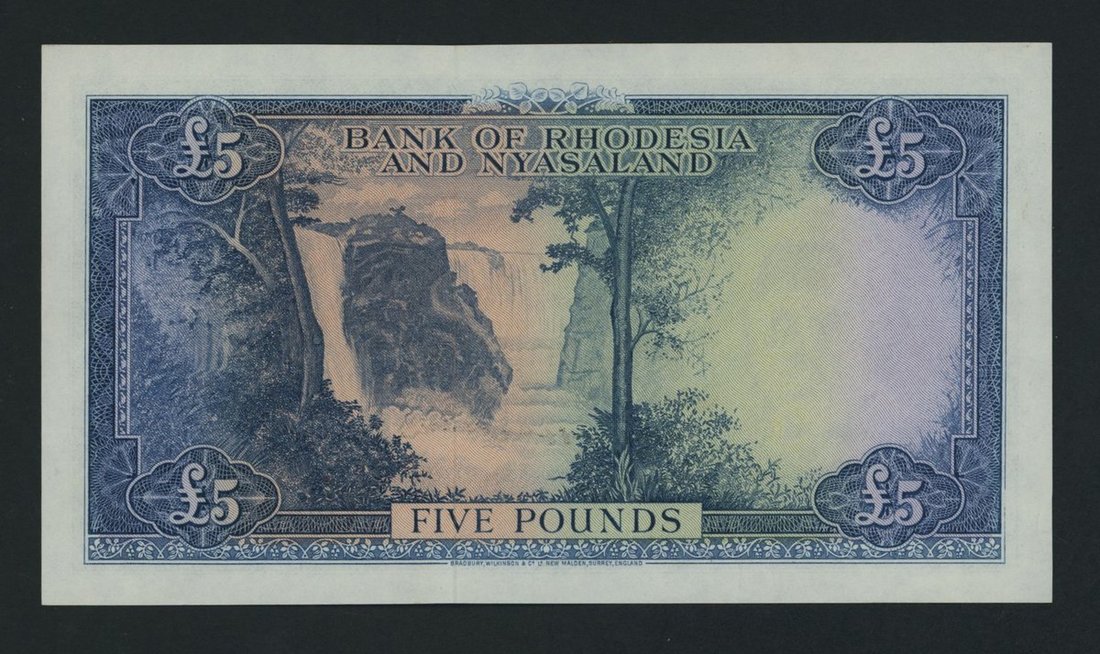 Blue on multicolour underprint, Elizabeth II at right, arms at top centre, sabre antelope at low left, view of Victoria Falls on reverse, signature of A. P. Grafftey-Smith, an incredibly low serial number 3 of the first prefix, as well as the first date of type of this ever popular Commonwealth issue.
