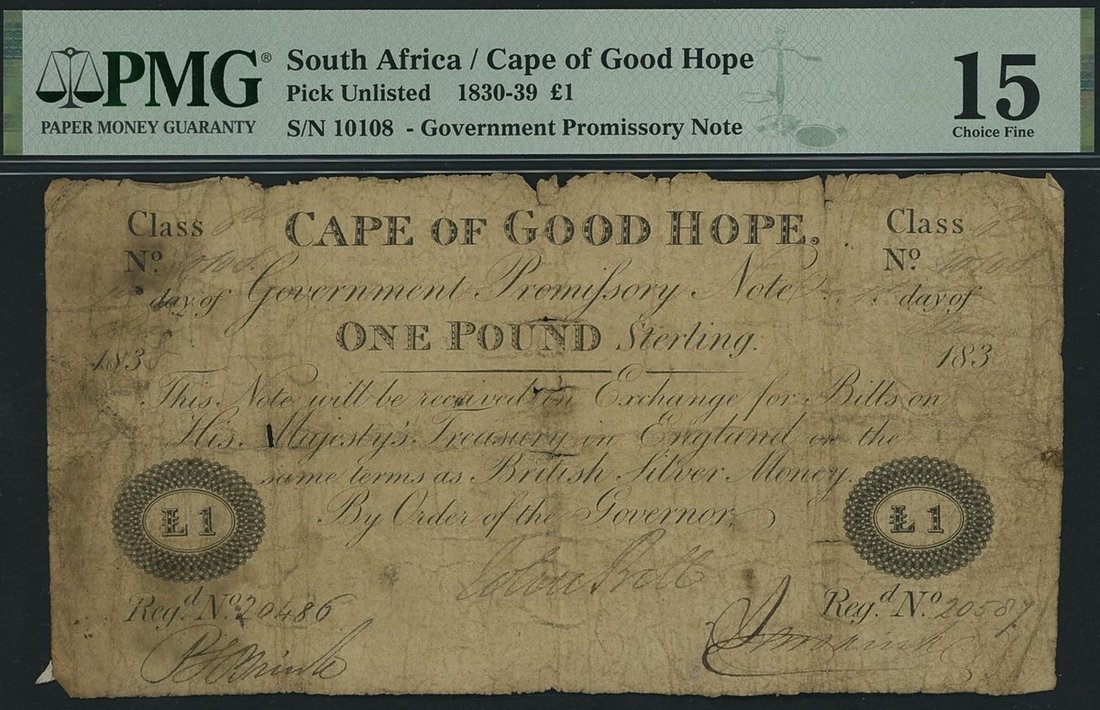 Cape of Good Hope, South Africa, government promissory note, £1, 1st August 1838, serial number 10108,