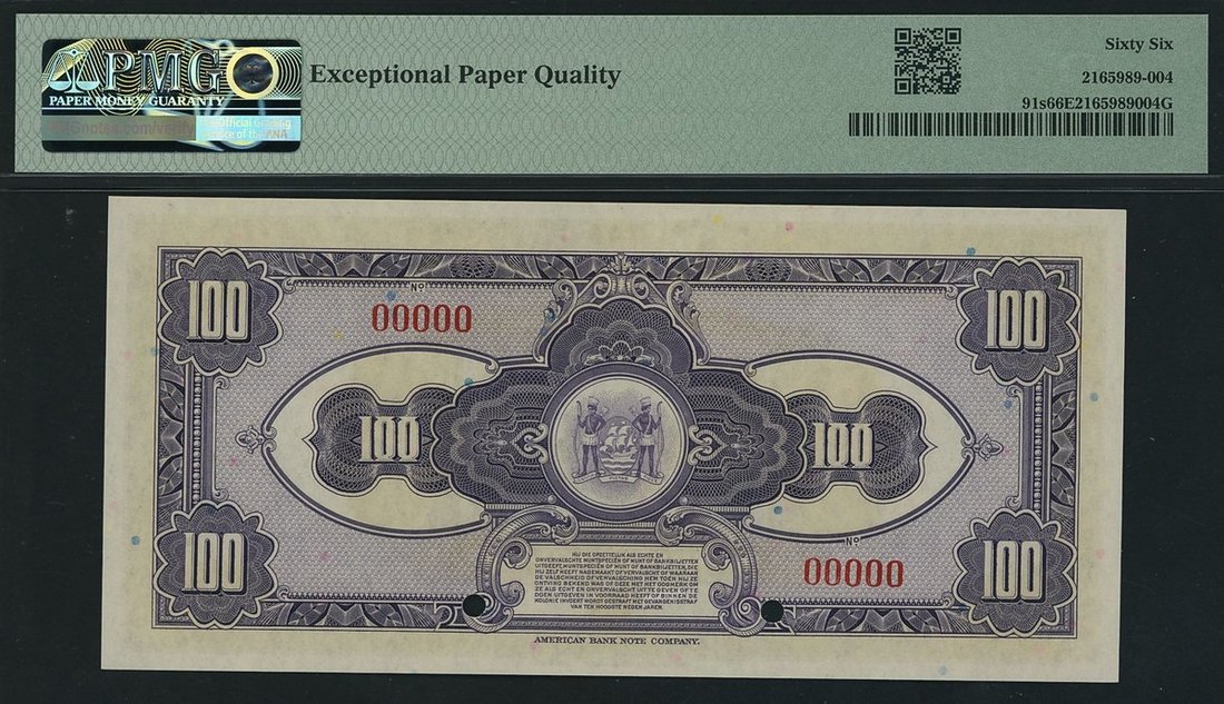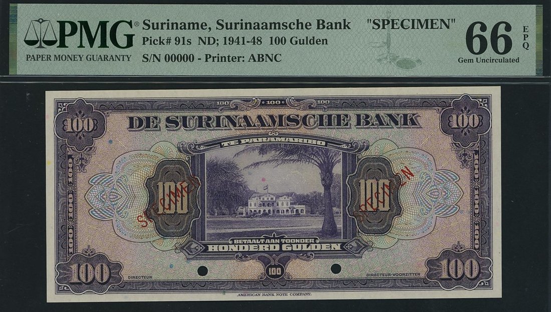 De Surinaamische Bank, Suriname, specimen 100 Gulden, ND (1942-48), 00000, (Pick 91s), in PMG holder 66 EPQ Gem Uncirculated, only 6 notes in higher grades on PMG census