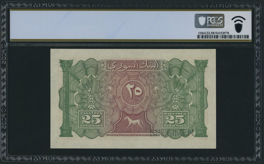 This note stands out for its vibrant colour palette, with intricate designs rendered in shades of blue, orange, green, and red. The front of the note prominently features Arabic and French inscriptions, reflecting the bilingual nature of the region under the French Mandate. At its centre lies a depiction of the iconic Umayyad Mosque in Damascus, one of the oldest and most revered mosques in the world. Built on the site of a Roman temple and a later Christian basilica, the Umayyad Mosque is a masterpiece of early Islamic architecture, renowned for its grandeur and historical significance as a spiritual and cultural hub. On the reverse, the note continues its artistic narrative with a striking composition: Corinthian columns, reminiscent of ancient Roman design, framing a walking horse. This imagery evokes a sense of power and movement while paying homage to the classical influences that shaped the region's artistic heritage. The combination of architectural and symbolic motifs ties the note's design to the rich history of Syria, a crossroads of civilizations. Issued during the transformative period of the French Mandate, this note represents a fascinating blend of historical, cultural, and artistic elements. Its vivid colours and detailed engravings make it a true collector's piece, capturing the essence of a complex era in the region's history.