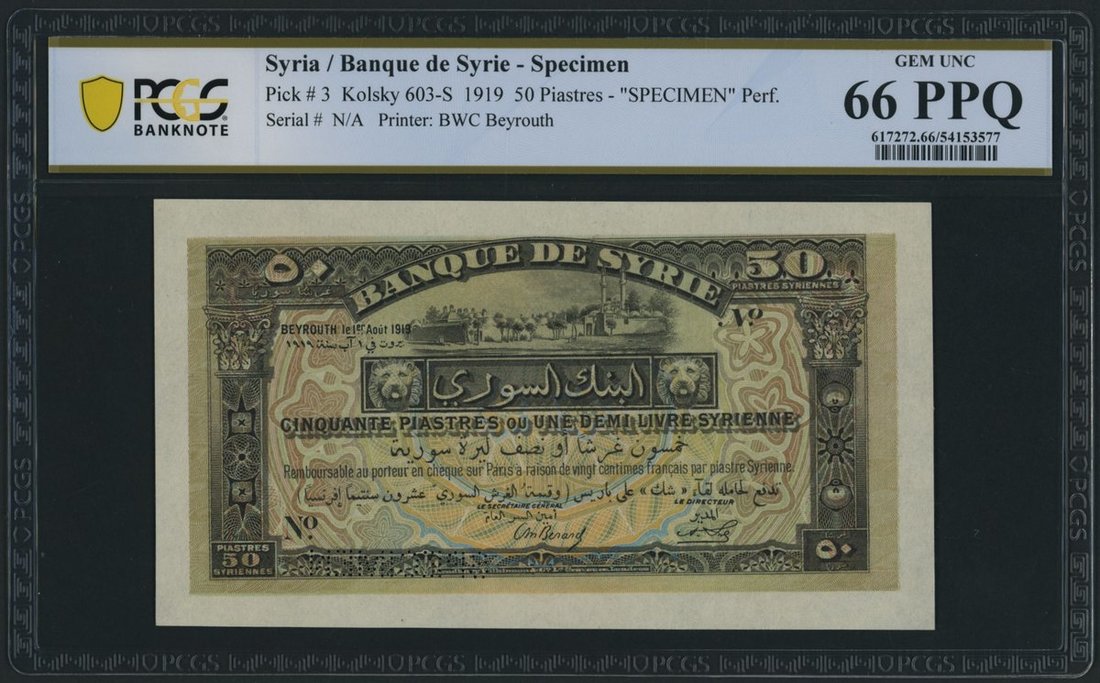 Banque de Syrie, Syria, specimen 50 Piastres, Beyrouth, 1st August 1919, a testament to the historical and cultural crossroads that defined Syria during the early French Mandate,