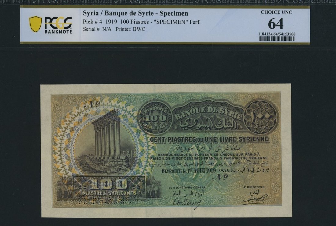 Banque de Syrie, Syria, specimen 100 Piastres, Beyrouth, 1st August 1919,