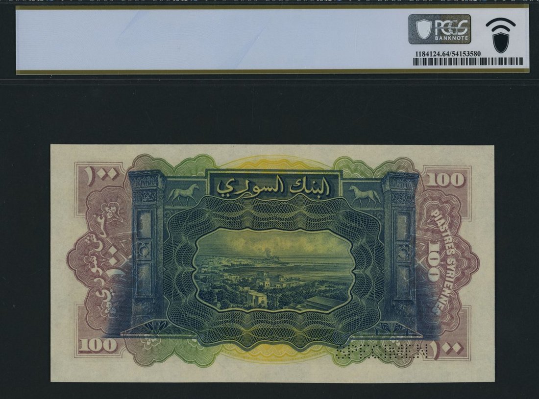 A multicoloured, vivid palette characterises this 100 Piastres note, consistent with the artistic vibrancy of the series. The obverse features knights in armour, mounted on horses, embodying the spirit of chivalry and historical strength. These figures are set against the ancient Corinthian columns of the Roman Temple of Jupiter in Baalbek, a lasting tribute to the region's Roman heritage. The reverse presents a dynamic portrayal of Beirut's port and cityscape, flanked by the same Corinthian columns and horses. This juxtaposition highlights Beirut's role as a thriving cultural and commercial hub in the early 20th century. The city's skyline, blending traditional and modern architectural styles, underscores its significance as a bridge between East and West. Bilingual inscriptions in Arabic and French provide essential historical context, reflecting the note's issuance under the French Mandate, adding further depth to its connection to the period.