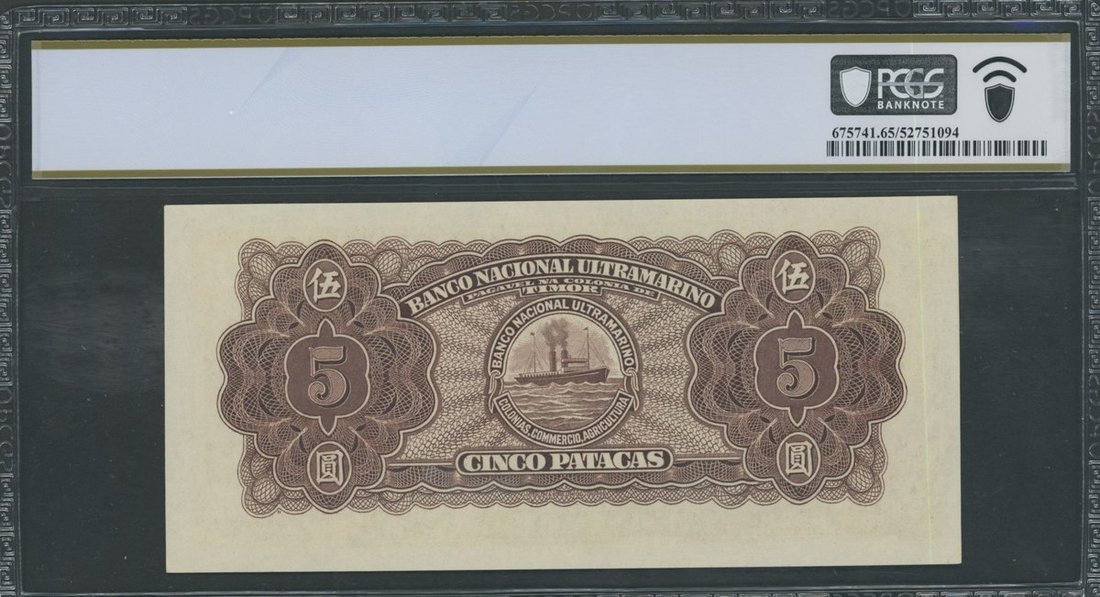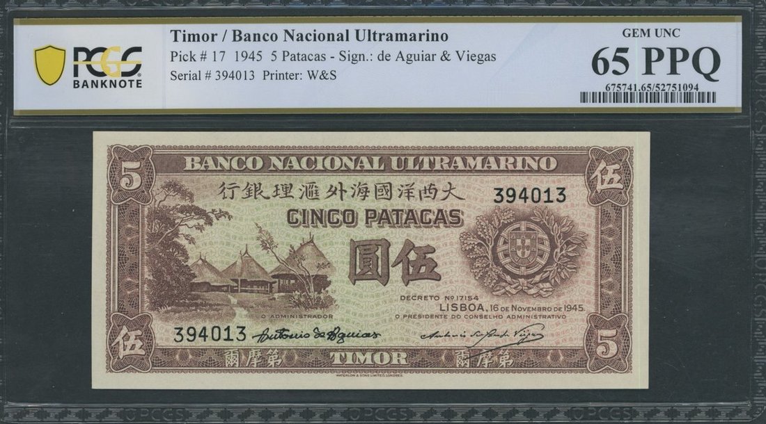 Banco Nacional Ultramarino, Timor, *TOP POP* 5 Patacas, 16th November 1945, serial number 394013, (Pick 17), in PCGS holder 65 PPQ Gem Uncirculated, the single finest graded note for the type on PCGS census